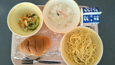 ・バターロール ・チキンスープスパゲティ ・フレンチサラダ ・牛乳 です。