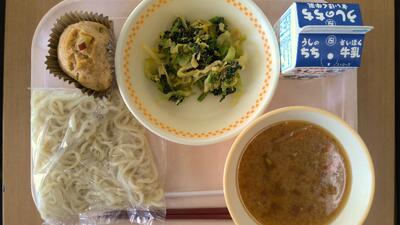 ・中華麺 ・味噌ラーメン ・野菜のアーモンド和え ・黒糖とさつま芋の蒸しパン ・牛乳 です。