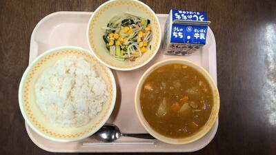 ・チキンカレーライス ・チンゲンサイとコーンのソテー 牛乳 です。