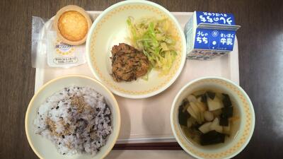 いろいろな種類がある古代米の中から、給食では「黒米」を使用しています。昔からお祝い用のお米として使われており、中国でも縁起が良いとされ「出世米」と呼ばれているそうです。給食室からのお祝いの気持ちを感じながら、今年度最後の給食を味わっていただきました。