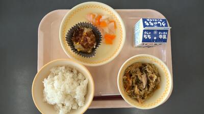 ・ご飯 ・切り干し大根の煮付け ・ミートカップ ・かぶのあちゃら漬け ・牛乳 です。