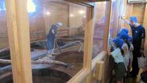 醤遊王国では、「もろみ」を撹拌する様子を見学しました。また、醤油づくりに使う桶など、様々な道具を間近で見ることができました。