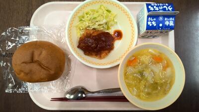 ・こどもパン ・トマトチキンカツ ・野菜スープ ・牛乳 です。
