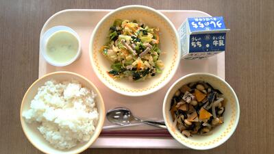 ・ご飯 ・ひじきの五目煮 ・山吹あえ ・手作り抹茶ゼリー ・牛乳 です。