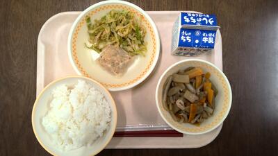 ・ご飯 ・豆腐焼売 ・うどのきんぴら ・キャベツのおかか和え ・牛乳 です。