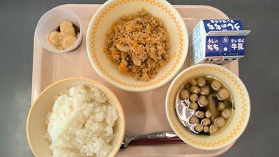 ・そぼろご飯 ・すまし汁 ・白玉餅の黒蜜がけ ・牛乳 です。