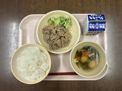 ・ご飯 ・お月見団子汁 ・豚肉の生姜焼き ・浅漬け ・牛乳 です。
