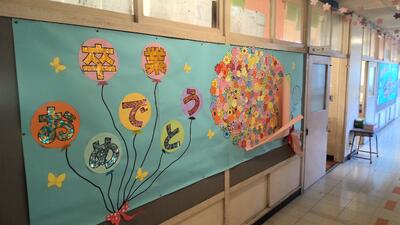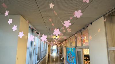職員室前には大きな花束が、図書室前には桜の木と花が、そして6年生教室前の廊下は、満開の桜の花が飾られました。壁面飾りは、2年生児童によるものです。