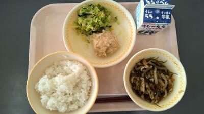・ご飯 ・豚肉と昆布の炒り煮 ・手作り山海しゅうまい ・ピリッとキャベツ ・牛乳 です。